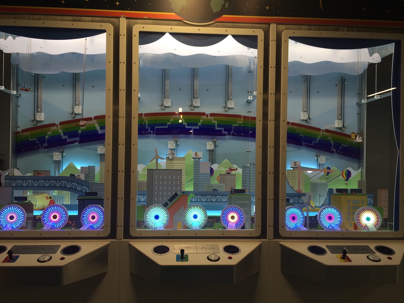 Another challenge was that the game play went thru several iterations before we landed on the final mechanism. In hindsight, I think we could have chosen simpler game play interaction, perhaps ditching the joystick and simply using a single button. But in the end the visitors figured it out and it was very satisfying watching them team up to and build rainbows.